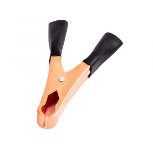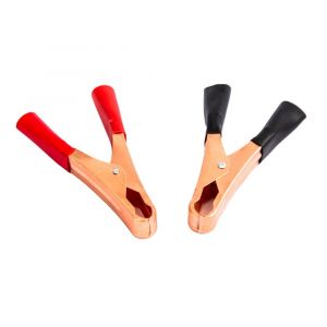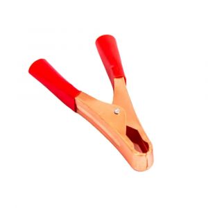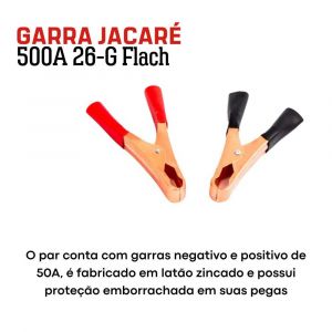 - O par conta com garras negativo e positivo de 500A, é fabricado em latão zincado e possui proteção emborrachada em suas pegas.