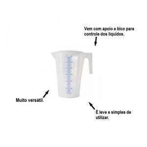 Prática e resistente a jarra em polietileno possui capacidade para até 1 litro, possui régua de graduação gravada na peça que mostra de 100ml até 1 litro, é muito versátil, e pode ser utilizado em ambientes internos, é fácil de higienizar, funcional e vem com apoio e bico para controle dos líquidos. Confira já!