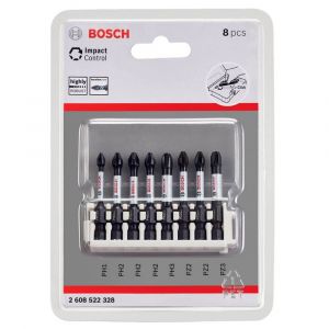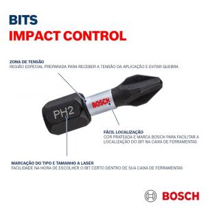 - O portfólio Bosch Impact Control é completo e possui pontas Philips (PH), Pozidriv (PZ) e Torx (T) com encaixe hexagonal 1/4" disponíveis em diferentes tamanhos e embalagens.