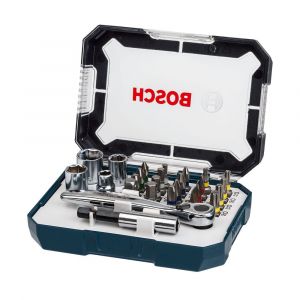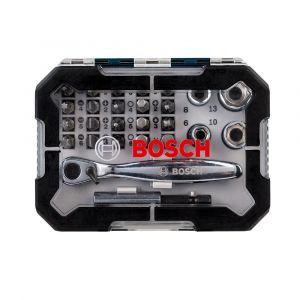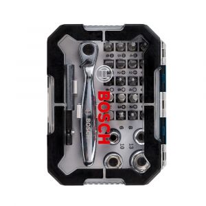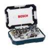 Kit Bosch de 26 peças com bits de alta qualidade, ideal para parafusadeiras e furadeiras, incluindo diversas pontas de parafuso (Phillips, fenda, Torx, Pozidriv) para diferentes tipos de parafusos, oferecendo versatilidade e durabilidade em qualquer trabalho.