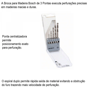 - A Broca para Madeira Bosch de 3 Pontas executa perfurações precisas em madeiras macias e duras.