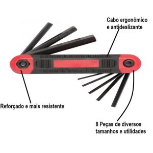 - Chaves inclusas: 01 Chave Allen 1,5 MM, 01 Chave Allen 2 MM, 01 Chave Allen 2,5 MM, 01 Chave Allen 3 MM, 01 Chave Allen 4 MM, 01 Chave Allen 5 MM, 01 Chave Allen 6 MM, 01 Chave Allen 08 MM