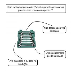 Cada chave deste conjunto possui um lado fixo e um lado com catraca, combinando a força da chave tradicional com a velocidade do sistema de catraca. Isso torna o trabalho em locais de difícil acesso muito mais simples e eficiente, economizando tempo e esforço do profissional.