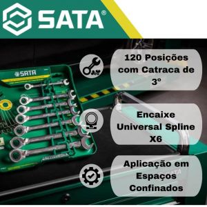 Jogo de chave combinada com catraca reversível, a única no Brasil! Sata foi a marca que criou a chave com catraca e inova mais uma vez, Chaves combinadas com catraca Sata são essenciais para a ergonomia e agilidade nas oficinas mecânicas e empresas de manutenção, oferecem a vantagem de apertar ou soltar o parafuso com apenas 3 graus de área livre, sem precisar ser retirada cada vez que houver um obstáculo no percurso, tornando-a uma chave perfeita para oficinas que trocam peças de difícil acesso. Garante menor desgaste durante aplicação, uso pois as chaves não espanam a cabeça de parafusos e porcas. Garanta já a sua!