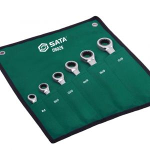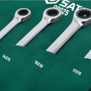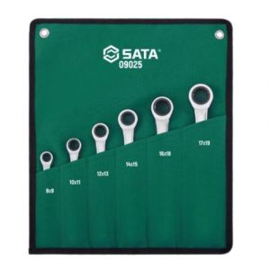 Jogo de Chaves Estrela com Catraca SATA 6 peças (8x9 a 17x19mm), 72 dentes, arco de giro de 5°, ideal para espaços de difícil acesso. Qualidade profissional, resistência e precisão para uso intenso.
