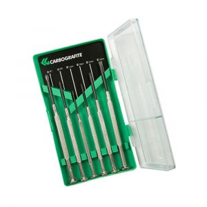 Jogo de Chave Precisão Fenda e Phillips, 6pçs Carbografite - Jogo com 6 peças - Contém: nº0; nº1; 1,4mm; 2mm; 2,4mm; 3mm - Fabricada em aço altamente resistente Indicado: - Trabalhos delicados