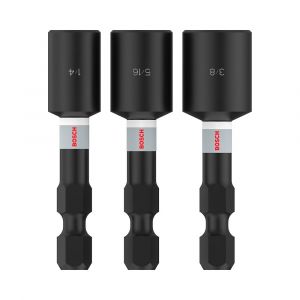 Jogo de Soquete Canhão de Impacto Bosch com 3 peças, 1/4", 5/16" e 3/8", são ideais para parafusadeiras e chaves de impacto, garantindo desempenho, durabilidade e encaixe preciso em aplicações profissionais e industriais.