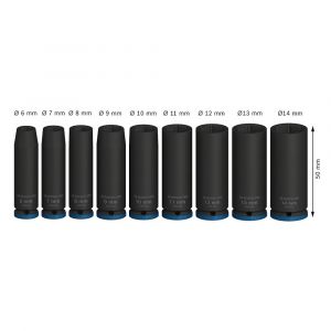 - Este jogo inclui: 1 soquete PRO impact longo 6mm, 1 soquete PRO impact longo 7mm, 1 soquete PRO impact longo 8mm, 1 soquete PRO impact longo 9mm, 1 soquete PRO impact longo 10mm, 1 soquete PRO impact longo 11mm, 1 soquete PRO impact longo 12mm, 1 soquete PRO impact longo 13mm e 1 soquete PRO impact longo 14mm.