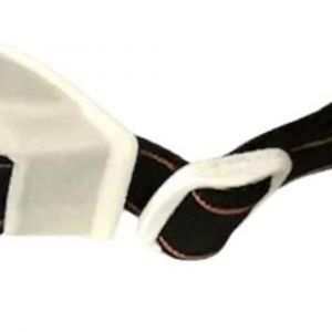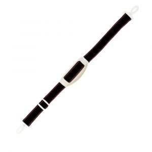 - Jugular fabricada em tecido elástico de látex e poliéster com presilhas em plástico rígido e queixeira em PVC flexível com três orifícios.