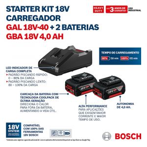 - O carregador de baterias rápido Bosch GAL 18V-40, de 18V e bivolt é compatível com 100% das Baterias 18V Bosch.
