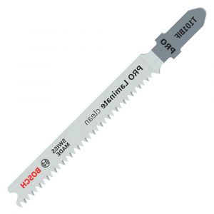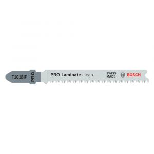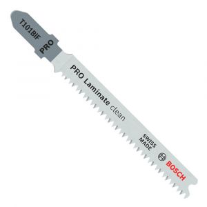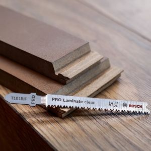 A lâmina de serra tico-tico Bosch PRO Laminate clean T101BIF é projetada para cortes retos e limpos em laminados e madeira maciça (até 15 mm), combina dentes HSS e corpo HCS e oferece até 5× mais vida útil que o modelo T101B.