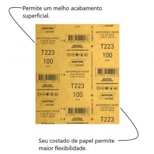 - A Folha de Lixa d'agua T223 é uma lixa de papel com grãos de Óxido de Alumínio Marrom que permite melhor acabamento superficial.
