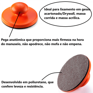- Contém sistema de fixação "Gancho-Argola" para discos de lixa de 150mm, sistema para troca rápidas, pega anatômica que proporciona mais firmeza na hora do manuseio, não apodrece, não mofa e não empena.