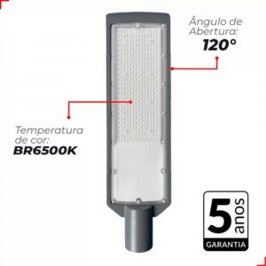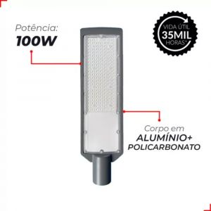 Luminária para postes, com design moderno e eficiente. Oferece iluminação em tom branco frio (6500K), ideal para ambientes externos como ruas, avenidas e estacionamentos. Conta com potência de 100W, alto fluxo luminoso.