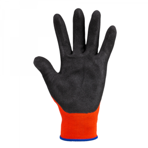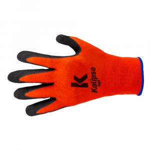 Luva de Segurança Tamnaho 8 Foam Kalipso confeccionada em Poliéster e Elastano com banho em espuma de borracha nitrílica Tipo Sand (Partículas de Areia) na palma e extremidade dos dedos, oferecendo excelente aderência. Punho elástico e acabamento em overloque com propriedade eletrostática.