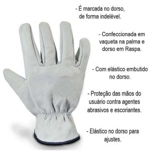 Luva de segurança confeccionada em vaqueta na palma e dorso em raspa, reforço externo de costura em vaqueta entre os dedos polegar e indicador e entre os dedos médio e anelar, reforço interno na palma, com elástico no dorso para ajuste. Indicado para proteção das mãos do usuário contra agentes abrasivos, cortantes e perfurantes. Oferece a você cliente mais eficiência e são ideais para proteger a mão, o punho, são confeccionadas em vaqueta natural.