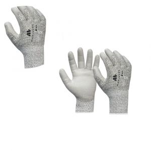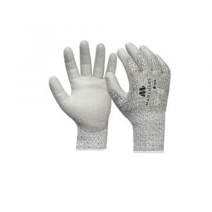 - Luva tricotada em fibras sintéticas de alta resistência a corte e banhada com Poliuretano (PU) na cor cinza na palma e nas pontas dos dedos, livre de fibras de vidro.