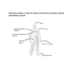 - Proteger o corpo do usuário contra riscos de poeiras, sujeiras particuladas em geral, e conforme CA para tipo 6, alguns riscos de origem química.