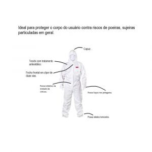 - Proteger o corpo do usuário contra riscos de poeiras, sujeiras particuladas em geral, e conforme CA para tipo 6, alguns riscos de origem química.