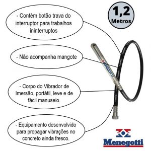 O mangote, mediante conexão ao motor, transmite o movimento a um elemento excêntrico situado dentro da ponteira, produzindo assim a vibração para ser aplicada ao concreto. Os Vibradores de Imersão Menegotti são equipamentos leves que proporcionam melhor ergonomia e portabilidade aos operadores. O uso deste equipamento resulta num concreto de ótima qualidade além de um excelente aspecto visual.