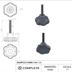 - O manípulo 45mm 1/4 x 1.1/2 Pol. é indicado para aperto e regulagem manual de peças, dispensando o uso de ferramentas.
