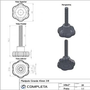 - O manípulo 45mm 3/8 x 2 Pol. é indicado para aperto e regulagem manual de peças, dispensando o uso de ferramentas.