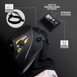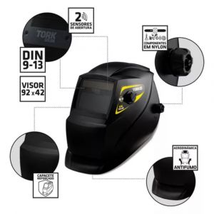A Máscara de Solda Automática KAB Solar MSEA 901 Tork oferece proteção com escurecimento em 0,0001s, recarga solar, ampla visão e conforto, leve, ajustável e ideal para profissionais que buscam segurança, praticidade e modernidade na soldagem.