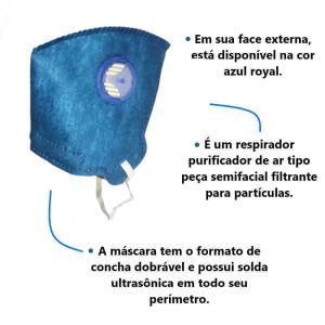 - A máscara tem o formato de concha dobrável e possui solda ultrasônica em todo seu perímetro. Possui também uma válvula de exalação que é fixada na máscara por soldagem ultrassom.