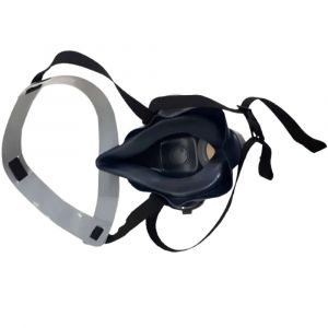 -Cada peça possui três aberturas em seu corpo: duas em cada lateral e uma na parte central inferior. Nas aberturas laterais existem dois dispositivos, um de cada lado, plásticos, dotados de tampa, com válvula de exalação na parte interna. Na abertura central inferior observa-se um bocal de material plástico, dotado de uma válvula de inalação na parte traseira. O bocal é confeccionado de material plástico rígido e é dotado de uma rosca interna na sua parte frontal, com um anel de vedação para fixação dos filtros. O corpo da peça possui um sistema de hastes laterais, em que são fixadas as presilhas de um tirante de cabeça, sendo este dotado de um suporte para a nuca.