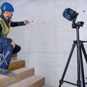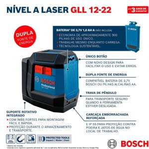 - O Nível a Laser Bosch GLL 12-22 tem alcance de 12 m e suporte giratório acoplado.