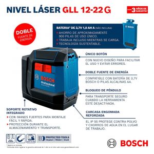 - O nível a laser verde Bosch GLL 12-22 G, é o nível ideal para começar: fácil de usar, maior visibilidade e versatilidade em uma só ferramenta.
