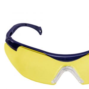 Óculos de proteção com arco plástico azul-escuro, visor de policarbonato (incolor, amarelo ou cinza), peça em “V” com apoio nasal de PVC e hastes ajustáveis em três estágios, fixadas por parafuso e encaixe deslizante.