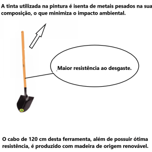 - O cabo de 120 cm desta ferramenta, além de possuir ótima resistência, é produzido com madeira de origem renovável.