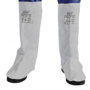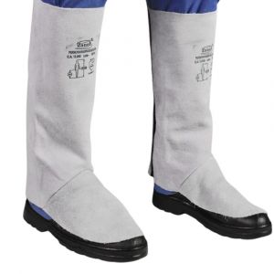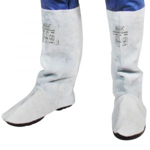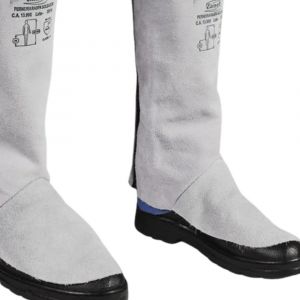 Perneira de raspa de couro bovino curtido ao cromo, espessura média 1,50 mm, gramatura de 0,815 kg/m². Costura em fio de algodão ou aramida. Fechamento com velcro. Inclui protetor de metatarso em raspa.