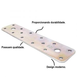 - Placa conectora dobrada fabricada em aço galvanizado zincado e tropicalizado, proporcionando resistência e durabilidade.