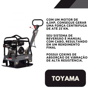 - Com um motor Toyama de 6,5 HP, equipado com filtro de ar banhado a óleo e embreagem centrífuga, este modelo consegue proporcionar uma força centrifuga de até 25 KN, resultando em mais eficiência de compactação e proporcionando resultados precisos e eficazes.