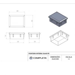 A Ponteira Interna 30x40 da Completa é a solução ideal para o acabamento e proteção de tubos e perfis metálicos retangulares. Projetada para encaixe interno, oferece um visual limpo e seguro, evitando danos a pisos e o acúmulo de sujeira.