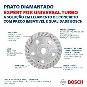 - O Rebolo diamantado 100 mm Turbo Expert for Universal da Bosch proporciona resultados profissionais de desbaste e polimento, de granito a concreto.