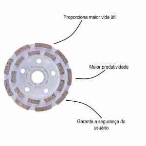 -  Prato diamantado Expert for concrete possui design segmento que proporciona maior vida útil devido aos seus 18 segmentos de diamante distribuídos em 2 linhas.