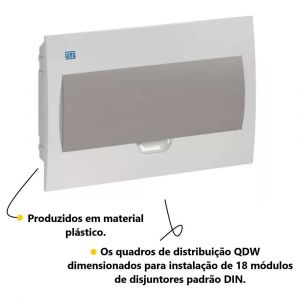 - Produzidos em material plástico, os quadros de distribuição QDW dimensionados para instalação de 18 módulos de disjuntores padrão DIN.