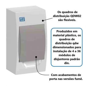 - Os quadros de distribuição QDW02 são flexiveis: Produzidos em material plástico, os quadros de distribuição qdw dimensionados para instalação de 4 a 36 módulos de disjuntores padrão din e com acabamentos de porta nas versões fumê.