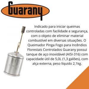 - O Queimador Pinga Fogo para Incêndios Florestais Controlados Guarany possui tanque de aço inoxidável (AISI-316) com capacidade útil de 5,0L (1,3 galões), com alça externa, peso líquido 2,1kg.