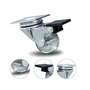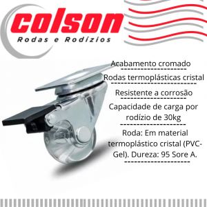 Rodízio Linha Gel fabricado em aço com dupla pista de esferas e acabamento cromado e rodas de material termoplástico cristal. Possui capacidade de carga por rodízio de 30 kg. Ele também é resistente a corrosão e apresenta boa mobilidade. Indicado para diversas aplicações, principalmente para móveis e decoração.