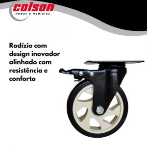 - Rodízio com design inovador alinhado com resistência e conforto, fabricado em aço e acabamento em pintura epóxi preto e roda com núcleo em polipropileno branco e banda em pvc preto.