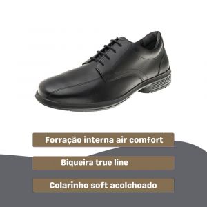 Sapato de couro na cor preta para profissionais administrativos, militares ou de serviços gerais. O London Safe tem biqueira true line, colarinho soft acolchoado, fechamento em cadarço!