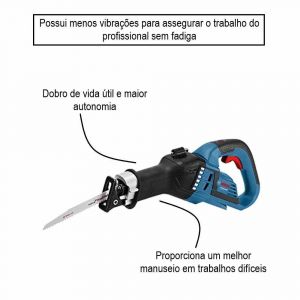 - A Serra Sabre a Bateria Bosch GSA 18V-32, 18V, possui motor sem escovas de carvão livre de manutenção, com o dobro de vida útil e maior autonomia.