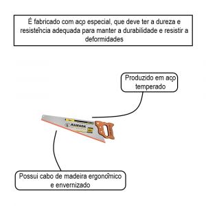 Serrote Ouro 24" Ramada - Produzido em aço temperado - Possui cabo de madeira ergonômico e envernizado - Os serrotes com dentes menores são para acabamentos precisos e com dentes maiores são utilizados para fornecer um maior rendimento - É fabricado com aço especial, que deve ter a dureza e resistência adequada para manter a durabilidade e resistir a deformidades - Cabo fixado com 3 parafusos e lâmina com protetor plástico para os dentes Indicado: - Cortar madeira em geral