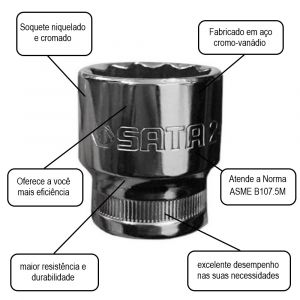 Soquete Estriado 1/2" 14mm Sata faz o aperto de porcas e parafusos sextavados. Um soquete de ótima resistência e durabilidade totalmente cromado para melhor proteção das ferramentas e facilidade na limpeza. Oferece a você cliente mais eficiência, proporcionando maior resistência e durabilidade.