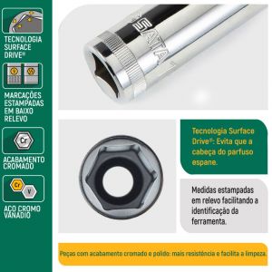 - Exclusiva tecnologia Surface Drive®: trabalha na superfície plana de parafusos sextavados e estriados, garante maior distribuição de força no corpo do soquete e no parafuso.