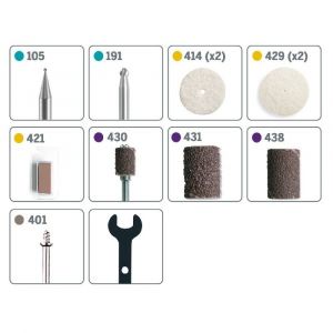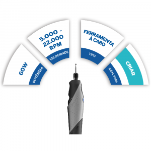 - Possui empunhadura de borracha, botão liga / desliga, botão de trava de segurança, controle de velocidade variável 5.000 a 22.000 rpm e cabo adaptador.